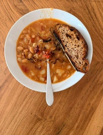 Serve with pasta or crusty bread or both, fried onions sprinkled on top, and a grating of parmesan, grana, or pecorino. As with most soups, it’s best the next day.